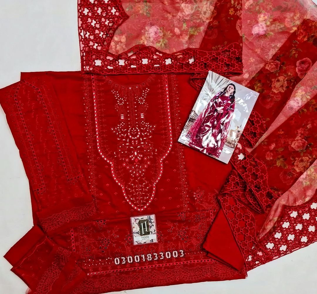 Front•Embroidered Chickenkari Front Embroidered Cutwork Front Daman Border SLEEVES•Embroidered Chickenkari Sleeves with Cutwork Sleeves Border BACK• Plain Embroidered Cut Work Daman Border DUPPATTA•Embroiderd   Heavy Cutwork Fully Organza Digital DuppattaTrouser•Dyed Plain...